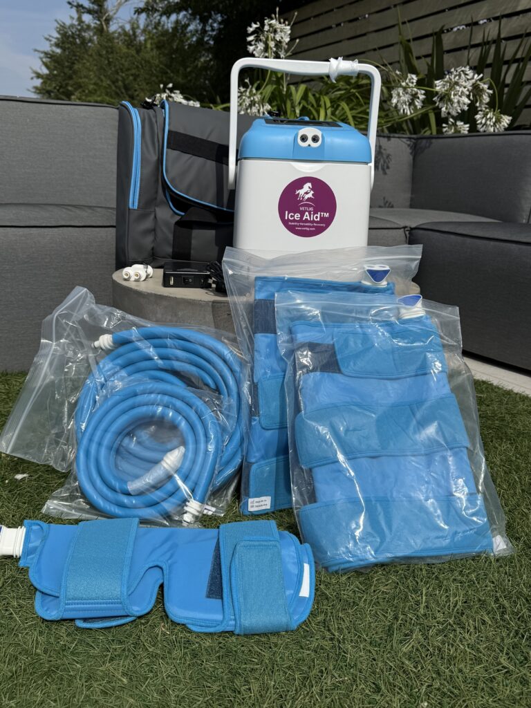 - ICE AID Cryo Dual is a mobile device not needing mains power. This package includes the unit, wraps of your choice, carry bag, dual or single hose, portable power bank (use in field or kennel) ICE AID is a simple to use cold compression therapy product that requires only ice, water and power. It’s unique design means it is easy to use, provides pain relief and reduces swelling and inflammation, making recovery faster. ( published data in veterinary journals) see clinical papers.